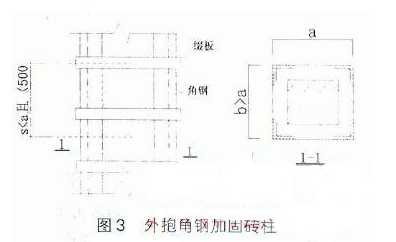 用水泥沙漿將角鋼粘貼于受荷磚柱的四周,并用卡具卡緊,隨即用綴板與角鋼焊接連成整體,去掉卡具,粉刷水泥漿以保護(hù)角鋼如圖3所示。