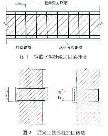 鋼筋水泥砂漿外加層加固法是指把需加固的磚墻表面除去粉刷層后,在磚墻兩面附設(shè)φ4~8mm的鋼筋網(wǎng)片,然后抹水泥沙漿面層的加固方法如圖1所示。