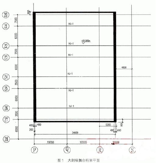 重慶大劇院工程項(xiàng)目總建筑面積103317m2,建筑高度64m,地上7層,地下2層,該工程結(jié)構(gòu)復(fù)雜,為筒體、框架、剪力墻加鋼結(jié)構(gòu)組成。該工程內(nèi)設(shè)大、中兩個(gè)劇場,大中劇場舞臺(tái)均為砼筒體結(jié)構(gòu)。屋頂均為鋼桁架,鋼桁架擱置底標(biāo)高分別為46m、37m。大劇場舞臺(tái)桁架(GHJ-1)每榀長25.05m、高4.6m、自重20.3t,整體重量193t;中劇場舞臺(tái)桁架(GHJ-2)每榀長22.55m、高4.1m,自重17.1t,整體重量133t。桁架由工廠標(biāo)準(zhǔn)化制作,預(yù)拼后將中間腹桿切斷,上下弦桿各分兩段,再運(yùn)輸?shù)浆F(xiàn)場安裝。下面僅對(duì)大劇場予以介紹,桁架布置如圖1、2所示。