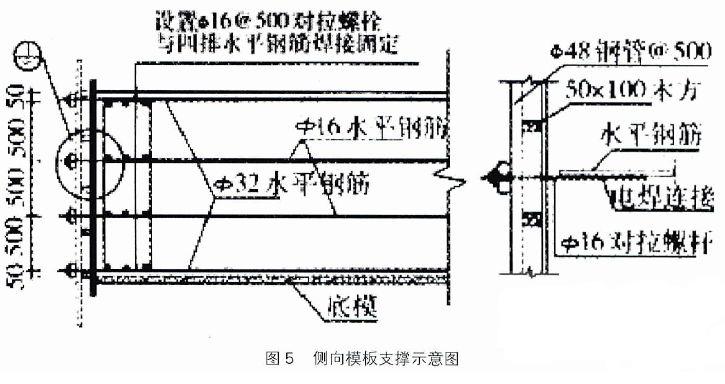 1600mm厚板側(cè)邊模板采用18mm厚木膠合模板,50mm×100mm木楞@300mm,外橫楞采用雙根φ48×35mm鋼管,下端及上口離側(cè)模邊50mm,中部間距@500mm,φ16mm對拉螺栓間距為@500mm雙向,并與板內(nèi)水平鋼筋焊牢,做法(見圖5)。