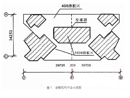整個上部住宅結(jié)構的荷載均通過第3層1.6m厚板結(jié)構轉(zhuǎn)換層傳遞給下層柱,設計時考慮除1.6m厚板區(qū)域外,其余板厚為400mm,在厚、薄板交接處,增加了1200mm寬的加腋構造(見圖2)本工程1層凈高為5.02m,2層凈高為4.35m。2層為室內(nèi)汽車庫,樓面板厚度為180mm,該層設計活荷載為10kN/m2。