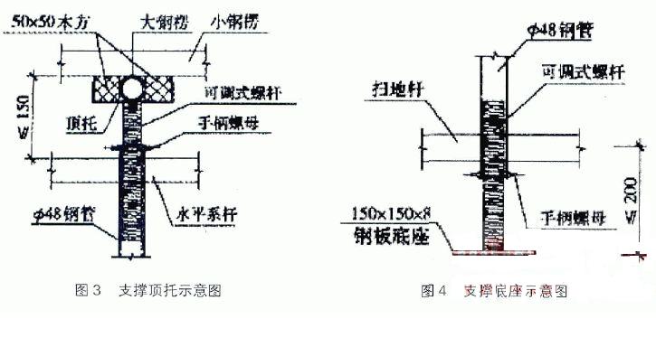每根立桿下均設置底座,底座安裝在立桿根部,防止立桿下沉,并將上部荷載分散傳遞給下層樓面。底座采用腳手架上使用的可調(diào)墊座,由150mm×150mm×8mm鋼板、立桿管、可調(diào)式螺桿、手柄螺母等組成,墊座與豎向鋼管連接外露部分距離應控制在200m之內(nèi)(見圖4)。