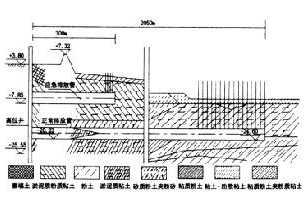 φ2000mm排海管道工程是嘉興市污水處理工程的一個(gè)重要組成部分。正常排放管總長(zhǎng)2060m,管道內(nèi)徑2000mm,從高位井向大堤外頂進(jìn),埋深9.30~21.81m,出洞口管內(nèi)底標(biāo)高為-20.23m,前1747.5m為下坡(-2.5‰)頂進(jìn),最后302.5m為平坡頂進(jìn),終點(diǎn)管內(nèi)底標(biāo)高為-24.60m.頂進(jìn)施工采用F-B型鋼承口式鋼筋混凝土管、楔形橡膠圈接口、多層膠合板襯墊。
