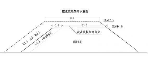 主要措施:上游側(cè)增加5m大石和特大石護坡、戧堤頂加高到高程687.5m,具體見下圖。