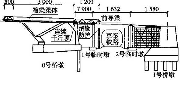3.7頂推施工箱梁頂推時,在橋臺上設(shè)置3道滑道和安裝2套千斤頂,通過拉索牽拉后導(dǎo)梁,由0號橋臺沿設(shè)計軸線連續(xù)頂推至對面,與1號橋墩通過現(xiàn)澆箱梁連接。為保證鐵路運輸及施工現(xiàn)場的安全,京秦鐵路特別為頂推作業(yè)停電停運80rain,所有的頂推及落梁施工必須全部在這段時間內(nèi)完成,所以施工時必須計算并掌握好頂推速度,保證頂推安全。頂推過程中,所有的工種必須聽從頂推總指揮的指令。頂推千斤頂?shù)挠捅镁芍骺嘏_統(tǒng)一控制。