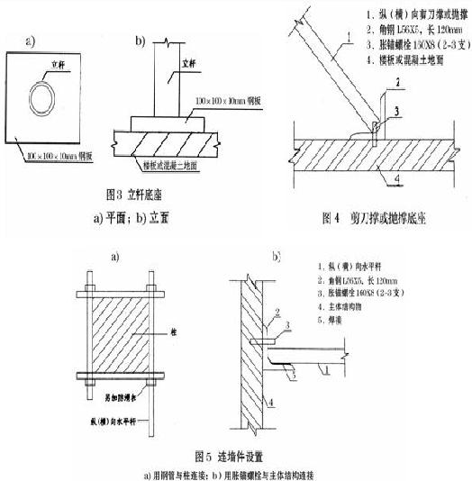 (4)立桿的底部應(yīng)設(shè)置底座或墊板(圖3),剪刀撐和拋撐的底座可參考圖4進(jìn)行設(shè)置,連墻件可參考圖5設(shè)置。