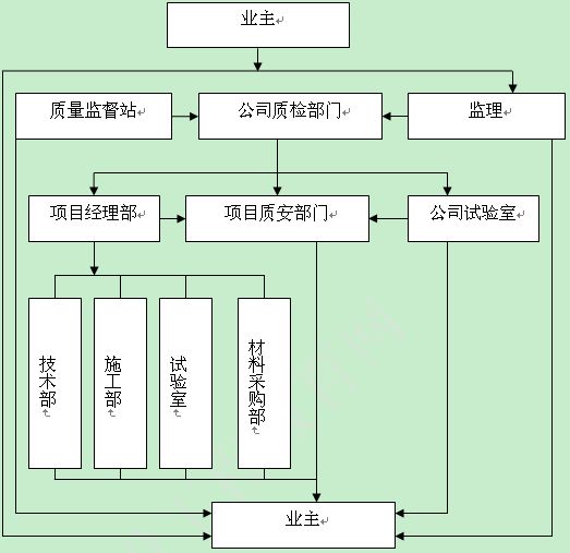 由業(yè)主、建設(shè)行政主管部門的質(zhì)量監(jiān)督機(jī)構(gòu)、公司質(zhì)檢部門、監(jiān)理、項(xiàng)目部的技術(shù)部、施工部、試驗(yàn)室、材料采購部與項(xiàng)目部的質(zhì)量安全部、公司的試驗(yàn)室組成項(xiàng)目的質(zhì)量檢測(cè)機(jī)構(gòu),負(fù)責(zé)對(duì)項(xiàng)目的質(zhì)量進(jìn)行檢測(cè),同時(shí)由業(yè)主牽頭,由建設(shè)、設(shè)計(jì)、監(jiān)理、勘察、施工五部門組成一個(gè)質(zhì)量驗(yàn)收機(jī)構(gòu),負(fù)責(zé)項(xiàng)目的中間和交付驗(yàn)收。