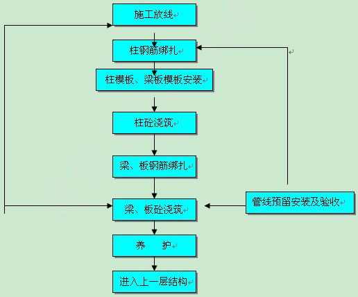測量彈線→柱鋼筋綁扎→梁柱模→柱砼→梁板模板安裝→梁板鋼筋綁扎→梁板砼→養(yǎng)護→砌體