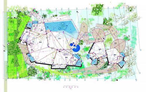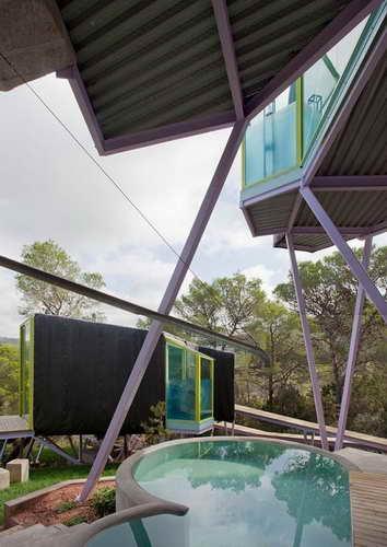 設(shè)計師主要通過以下幾種途徑保護自然的可持續(xù)性發(fā)展:A.最大限度減少對樹木的移動和修建。設(shè)計者在最初階段就對每株樹木和灌木的分布情況作了細致的研究并制成地圖,并以此為依據(jù)設(shè)計房屋的幾何支撐結(jié)構(gòu),將房屋設(shè)計在樹木的空隙間,一些樹木甚至成為房間的內(nèi)景。B. 將超過80%的建筑通過樁體高架支撐起來以避免對地表地貌的影響。包括石面路,種植植物,排水溝或者其他人造物最終都有可能影響當?shù)氐膭又参锖屯寥乐g的密切聯(lián)系。C.將所有垃圾過濾和處理設(shè)備以及水箱等都建在一個鋼筋混凝土結(jié)構(gòu)的容器里,避免它們成為山谷的污染者。D.為補償因建造支撐地基和鋼筋混凝土容器對地表土壤的破壞,建筑師在建筑外部許多地方加覆了培養(yǎng)土層,土壤薄弱的地方還添加了保水膠質(zhì)。這樣經(jīng)過一段適應(yīng)期后,這些培養(yǎng)土層就會成為建筑的有機部分,也會成為許多動植物的棲居地,建筑師通過這種方式彌補因建筑施工對原有土地的影響。