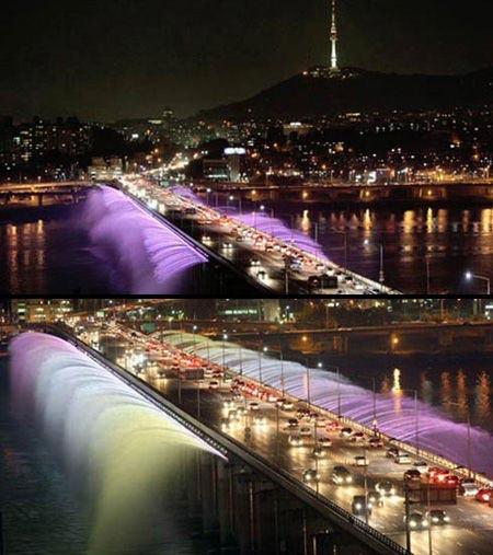 韓國首爾的盤浦噴泉大橋橫跨漢江,是當(dāng)?shù)氐闹饕^光景點。在2008年的擴建工程中,在橋的兩側(cè)安裝了9380個噴泉口,噴水量達到每分鐘190噸。夜間,在特別照明設(shè)備的映襯下,大橋兩側(cè)五顏六色的噴泉使人仿佛穿越時空,步入夢幻國度,美不勝收。