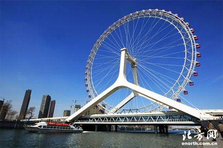 位于天津的永樂橋,兼具交通和觀光功用,橫跨海河,它的特別之處在于橋上矗立著一個名為“天津之眼”的高大雄偉的觀光摩天輪,輪外裝掛著共48個透明觀光艙,每個觀光艙可容納8人,可供384人同時觀光,游客乘坐摩天輪最高可達到120米的高空,盡享天“輪”之樂。