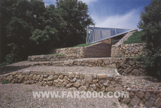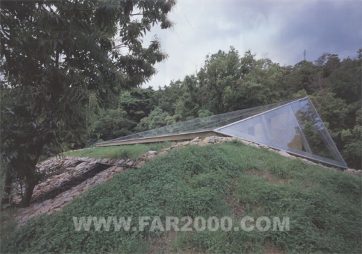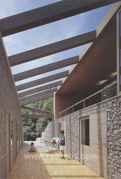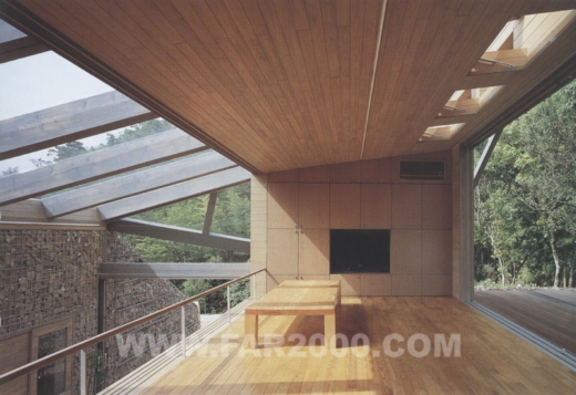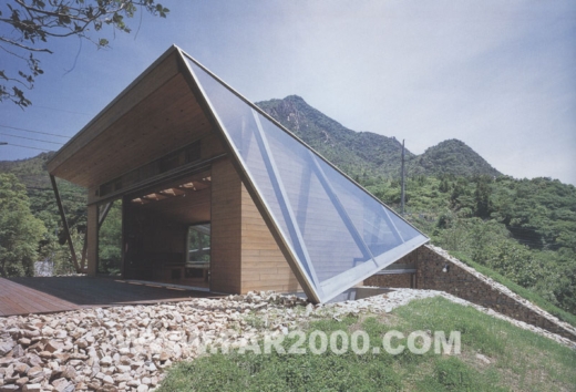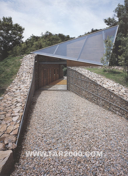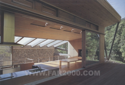 該建筑位于瀨戶內(nèi)海周邊平原與山地交界處的山谷之中,包括防護(hù)林在內(nèi)的地皮面積超過了12000平方米,可謂廣袤無邊。設(shè)計(jì)師因地制宜,考慮了風(fēng)向、日照等因素受到地形的影響,作了一次創(chuàng)造性的嘗試。山谷的形狀從西北向東南延伸,所以陽光照射面清晨為西、傍晚為東。照射面與非照射面之間產(chǎn)生溫差,空氣流動(dòng)方向隨之變化,導(dǎo)致了山谷風(fēng)的形成。由此,獨(dú)特的室外風(fēng)道穿插于住宅中,其方向與山谷一致,仿佛是山谷的縮景。兩側(cè)住宅面向風(fēng)道而開門,外周環(huán)繞著保熱性能良好的土墻。風(fēng)、光從風(fēng)道一側(cè)進(jìn)入室內(nèi),營(yíng)造了一個(gè)冬暖夏涼、夜暖晝涼的宜人環(huán)境。風(fēng)道上方裝有木框玻璃桁架。玻璃和天花板之間的集熱層可收集太陽能,保持室內(nèi)溫度。打開各房間的門窗隔扇,風(fēng)道便會(huì)與地下室連通,在豎直方向?qū)⑸焦蕊L(fēng)導(dǎo)入作為動(dòng)力源。關(guān)上門窗隔扇時(shí)室內(nèi)能量得以密閉儲(chǔ)存,維持冬季供暖。大玻璃窗使主人在房間內(nèi)能夠欣賞窗外的自然風(fēng)景,感受四季的變幻。自然的恩惠必然會(huì)賜予人們舒適與安寧的生活,這正是設(shè)計(jì)師想要達(dá)到的。
