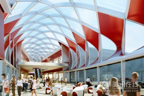 工程師Buro Happold設(shè)計的自由跨度的屋頂用紅色ETFE材料作覆面,其他用于立面的材料包括紅色鋁板和玻璃等。