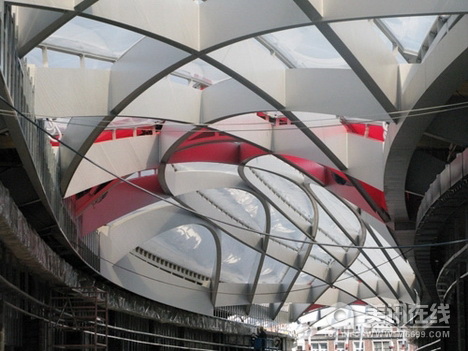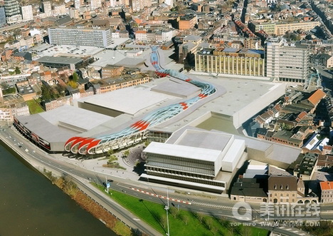 該事物所設(shè)計了一座長350米的購物中心,蜿蜒于場地之間,將媒體城的其他部分,如比利時國家電視臺的演播室、一座影院和溜冰場等與該市的舊市場連接起來。 該項目采用了波浪形鋼質(zhì)屋頂網(wǎng)絡(luò)架構(gòu),高度從入口處的20米下降到其他地方僅比人高一頭的高度,并且向下構(gòu)成了建筑的立面。
