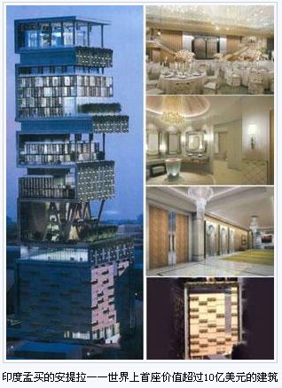 印度信誠(chéng)工業(yè)集團(tuán)董事總經(jīng)理穆穆凱什·阿姆巴尼就是這座摩天大樓的擁有者。這位全球富豪榜排在第5位的超級(jí)富翁身家超過(guò)430億美元。安提拉位于印度孟買市郊,據(jù)說(shuō)這棟大樓花掉阿姆巴尼20億美元!