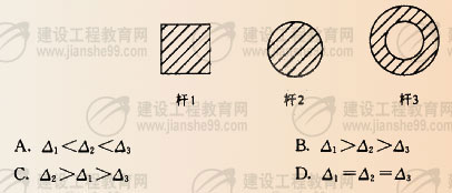 6、三根桿件,截面面積、桿件長度、材質(zhì)均相同,截面形狀如下圖所示,當桿件兩端受相同的軸向拉力時各桿件的伸長量分別為Δ1、Δ2、Δ3,關(guān)于三者的關(guān)系,以下哪一種正確?( )