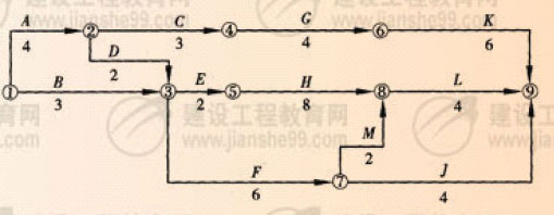 1.關(guān)鍵線路為:①→②→③→⑤→⑧→⑨關(guān)鍵工作為:A、D、E、H、1、