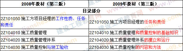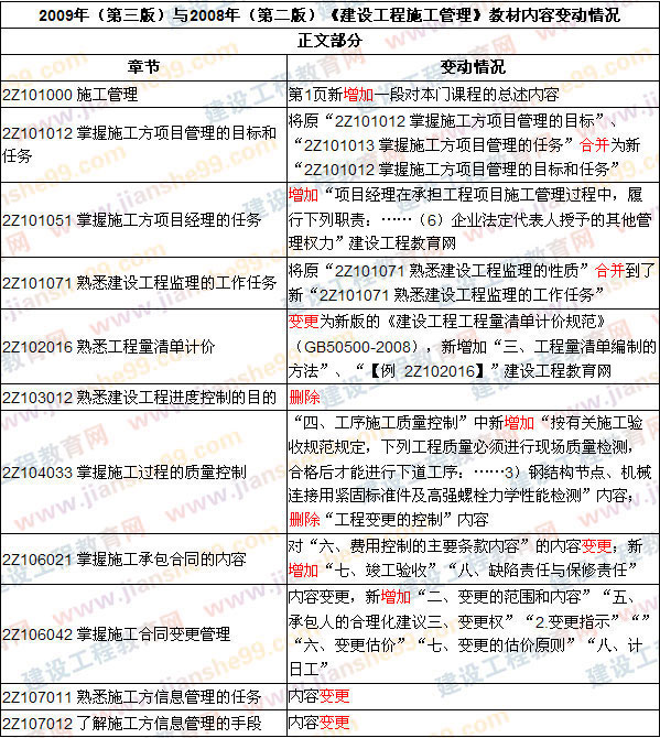 2009版教材將2008版教材的個(gè)別章節(jié)進(jìn)行了合并、刪除,在“2Z101051 掌握施工方項(xiàng)目經(jīng)理的任務(wù)”、“2Z104033 掌握施工過程的質(zhì)量控制”、“2Z106021 掌握施工承包合同的內(nèi)容”、“2Z106042 掌握施工合同變更管理”中的內(nèi)容進(jìn)行了補(bǔ)充和完善,對(duì)“2Z107011 熟悉施工方信息管理的任務(wù)”和“2Z107012 了解施工方信息管理的手段”等章節(jié)的內(nèi)容進(jìn)行了變更和調(diào)整。