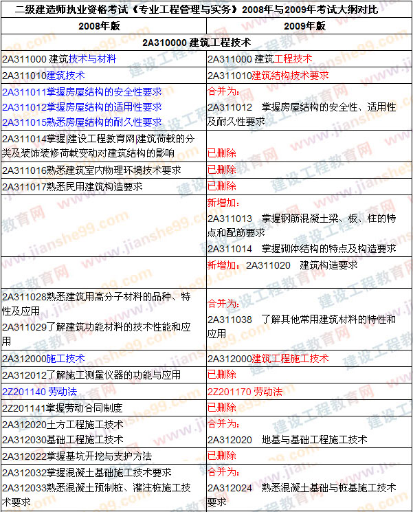 二級(jí)建造師考試大綱對(duì)比《建筑工程專業(yè)》(09、08年)