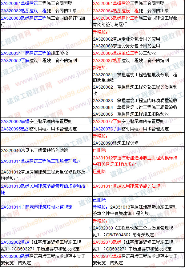 6)將“單位工程竣工驗(yàn)收”由“了解”提高到“掌握”;“建筑工程竣工資料的編制”由“了解”提高到“熟悉”