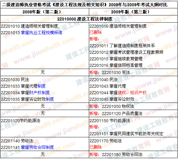2009年版《建設工程法規(guī)及相關知識》大綱與教材的內容相比較2008年版變化不是很大,但也在考試內容上做了一些調整,如刪除了建設工程法律制度中刪除了執(zhí)業(yè)工程規(guī)模標準章節(jié),新增了建造師制度框架體系、建造師考試管理、繼續(xù)教育管理、信用檔案管理等,也新增了憲法相關知識點,并把代理制度的考核點轉變?yōu)閷Υ碇R的考核,而對財產權制度的考核轉變?yōu)閷?、知識產權的考核等。來源建設工程教育網,轉載請注明出處!