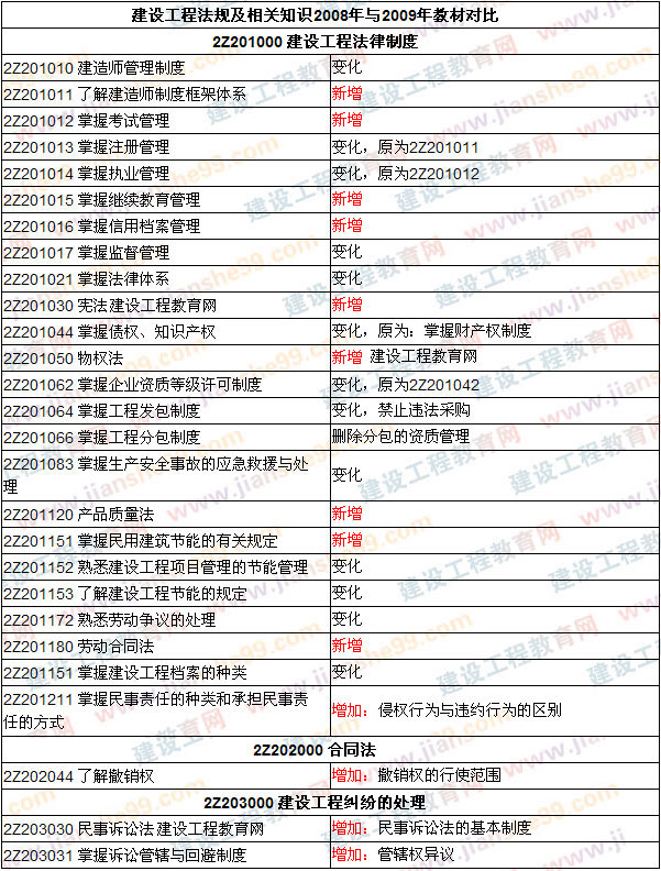 2009版教材增加憲法、物權(quán)法和勞動合同法三個(gè)法規(guī);刪除了執(zhí)業(yè)工程規(guī)模標(biāo)準(zhǔn)、勞動合同制度兩個(gè)內(nèi)容;建造師相關(guān)管理制度中增加了4節(jié)的內(nèi)容;節(jié)約能源法中增加了民用建筑節(jié)能的有關(guān)規(guī)定。來源:jianshe99,轉(zhuǎn)載請注明出處!