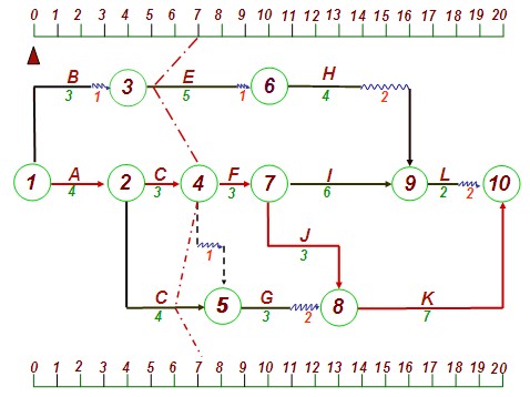當(dāng)工程進(jìn)行到第七個(gè)月末時(shí),進(jìn)度檢查繪出的實(shí)際進(jìn)度前鋒線如圖5.1所示。