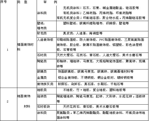 (2)按照建筑裝飾裝修材料的材質(zhì),可分為石材類、陶瓷類、皮革類、玻璃類、木質(zhì)類、塑料類、有機和無機纖維類、涂料類、金屬類、無機膠凝材料等。