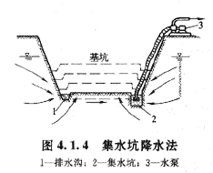 明排水法是在基坑開挖過(guò)程中,在坑底設(shè)置集水坑,并沿坑底周圍或中央開挖排水溝,使水流人集水坑,然后用水泵抽走(圖4.1.4)抽出的水應(yīng)予引開,以防倒流。