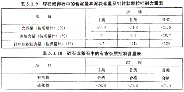 石子中含有黏土、淤泥、有機物、硫化物及硫酸鹽和其他活性氧化硅等雜質。有的雜質影響粘結力,有的能和水泥產生化學作用而破壞混凝土結構。此外,針片狀顆粒的含量也不宜過多。其控制含量見表3.1.9和表3.1.10.