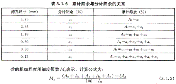 篩分析法是用一套孔徑為4.75mm、2.36mm、1.18mm、0.60mm、0.30mm和0.15mm的標(biāo)準(zhǔn)方孔篩的,按照篩孔的大小順序,將用9.50mm方孔篩篩出的500g干砂,由粗到過篩,稱得各號(hào)篩上的篩余量。并且計(jì)算出各篩上的分計(jì)篩余百分率a1、a2、a3、a4、a5和a6.(各篩上的篩余量占砂樣總重的百分率)及累計(jì)篩余百分率A1、A2、A3、A4、A5和A6(各號(hào)篩的分計(jì)篩余百分率加上大于該篩的分計(jì)篩余百分率之和),其關(guān)系見表3.1.6.