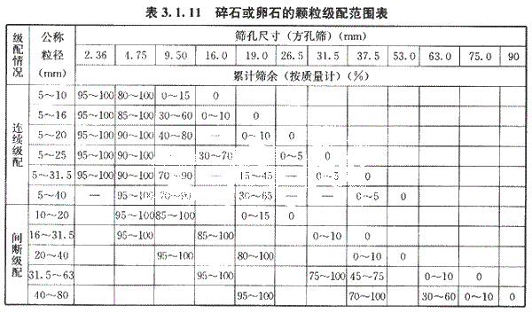 測定石子的最大粒徑與顆粒級配仍采用篩分法。將石子用標(biāo)準(zhǔn)篩篩分后,計(jì)算出各篩分計(jì)篩余百分率和累計(jì)篩余百分率。以公稱粒級的上限為該粒級的最大粒徑。其顆粒級配應(yīng)符合表3.1.11的規(guī)定。