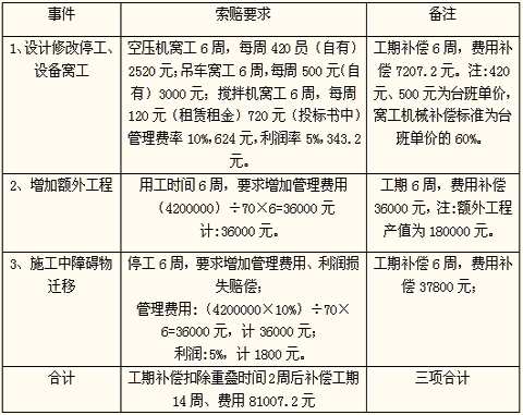 【問題】某省一道橋項目招標文件中規(guī)定采用FIDIC合同條款,總工期不超過2年,提供了工程量清單和施工要求、設計文件。紅星公司中標,中標合同為420萬元,工期70周,施工開始,承包方發(fā)現(xiàn)橋梁鋼筋部分設計有誤,設計方代表認可并提出了修改設計,工程師指令承包方停工。修改圖紙期間暫停施工,圖紙6周后才交給承包方,重新施工后出現(xiàn)特別惡劣天氣,以及若干次業(yè)主方提出的工程變更。承包方根據(jù)上述情況提出了索賠要求,并提交了索賠清單見表5—5.