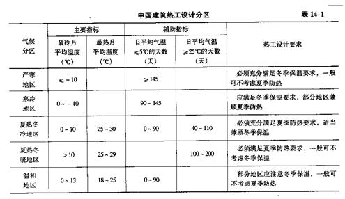 我國幅員遼闊。地形復(fù)雜,各地由寸:緯度、地勢和地理?xiàng)l件的不同,氣候差異懸殊.不同的氣候條件對房屋建筑提出的要求不同,為使建筑能夠充分地利用和適應(yīng)本地的氣候條件,我國各地氣候作如下劃分(表14-1),在進(jìn)行設(shè)計(jì)時(shí),應(yīng)滿足不同的熱工設(shè)計(jì)要求。