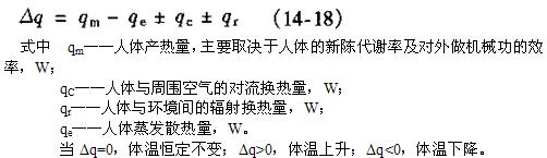 室內(nèi)熱環(huán)境對人體的影響主要表現(xiàn)在人的冷熱感。人體的冷熱感取決于人體新陳代謝 產(chǎn)生的熱量和人體向周圍環(huán)境散熱量之間的平衡關(guān)系,人體熱平衡方程表示如下: