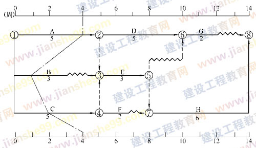 3.某工程雙代號(hào)時(shí)標(biāo)網(wǎng)絡(luò)計(jì)劃及第4周末檢查實(shí)際進(jìn)度時(shí)前鋒線如下圖所示,檢查結(jié)果表明( ?。?。