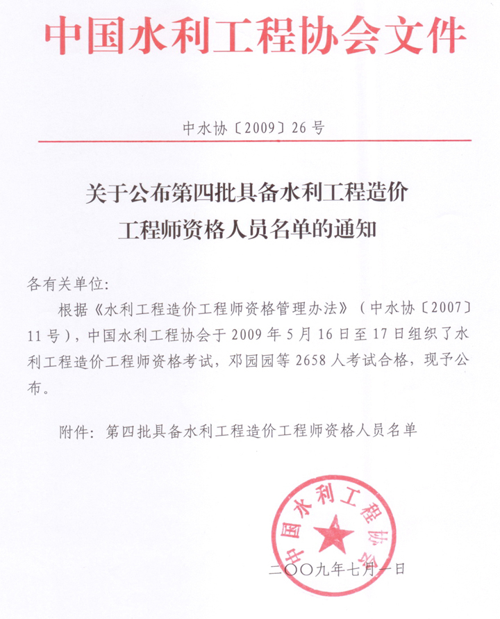 關(guān)于公布第四批具備水利工程造價工程師資格人員名單的通知