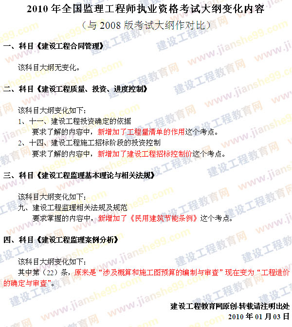 2010年全國監(jiān)理工程師執(zhí)業(yè)資格考試大綱變化內(nèi)容