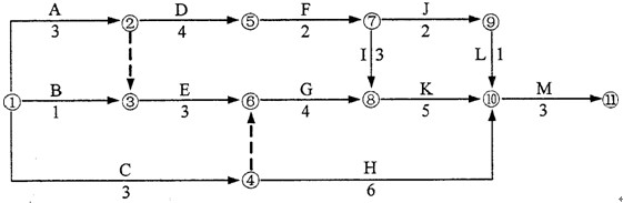1.確定初始計劃的總工期,并確定關(guān)鍵線路及工作E的總時差。