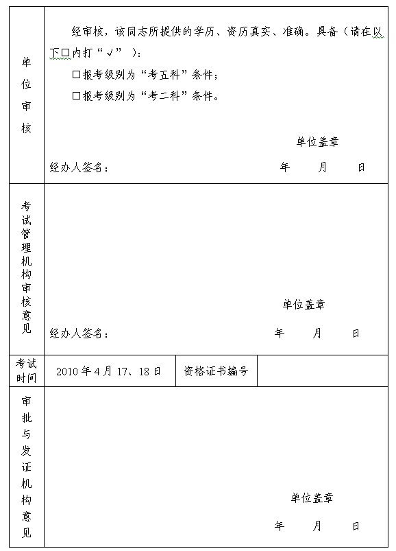 2. 此表“單位審核”欄由單位填寫。單位對報考者所填內(nèi)容,提交的材料(含照片)等是否真實進行審核確認,加蓋公章;