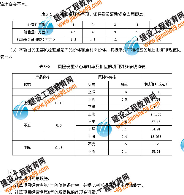 ?。?)項(xiàng)目經(jīng)營(yíng)期各年銷售量及流動(dòng)資金占用額見表5-1。為計(jì)算簡(jiǎn)便,假設(shè)生產(chǎn)標(biāo)準(zhǔn)桌燈占用的