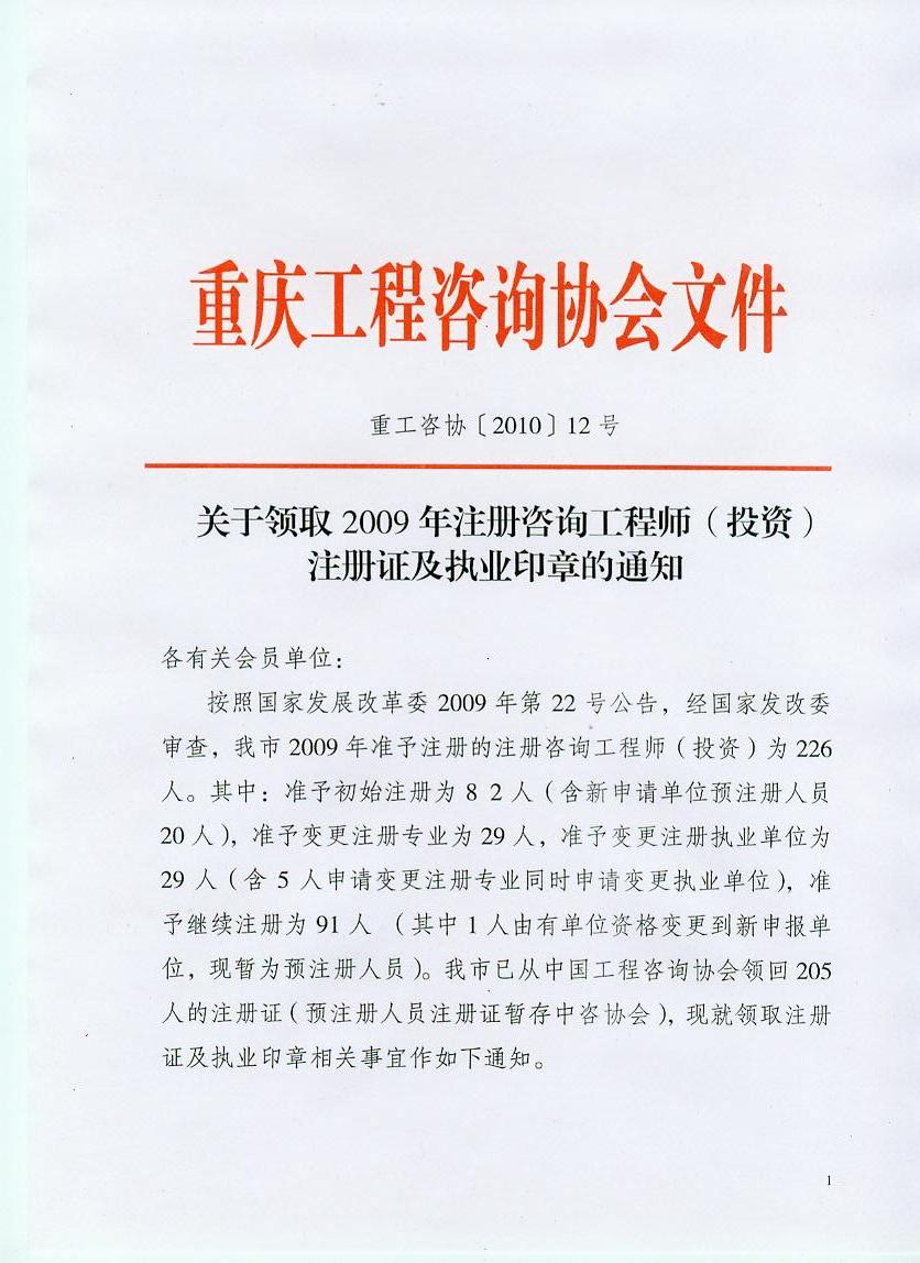 重慶市領(lǐng)取09年咨詢(xún)工程師注冊(cè)證及執(zhí)業(yè)印章的通知