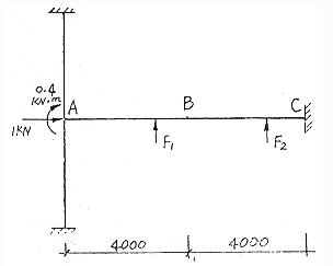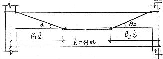 本工程把無粘結(jié)筋在梁頂處的折角設(shè)在梁柱交界處,如圖1.其優(yōu)點(diǎn)為:施工方便,能同時加強(qiáng)梁的正載面和斜載面強(qiáng)度,保持原樓面的平整。梁底折角的位置,即β1和β2的取值,一般為β1=0.25~0.5,β2=0.25~0.35〔3〕。Β1和β2的取值范圍較大,如何針對本工程,求出合適的β1和β2值,本文對此進(jìn)行了分析。取無粘結(jié)筋的拉力為1kN,梁端力矩為1kN×0.4m=0.4kN*m,0.4m為梁高的一半,無粘結(jié)筋的偏心距,由圖1中折角θ1-θ2,可求出圖2中的F1和F2,即F1=1.sinθ1、F2=1.sinθ2.本文以預(yù)應(yīng)力(圖2外力)產(chǎn)生的彎矩圖形狀與外荷載產(chǎn)生的彎矩圖形狀大致相同,彎矩值相反來確定合理的β1、β2值,即以預(yù)應(yīng)力均衡地抵消各截面彎矩為合理。依此,取β1=0.45、β2=0.3.。