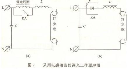 如果采用電感鎮(zhèn)流,調(diào)光一般采用串聯(lián)電感或可控硅調(diào)光的方法,工作原理如圖2所示,但是常用串聯(lián)電感調(diào)光的工作方法,在這種工作方式下需要加一個并聯(lián)補償電容。