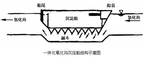 一體化氧化溝是一種采用曝氣與沉淀合建的形式,是美國(guó)于80年代初至今一直開(kāi)發(fā)研究的一種新型污水處理系統(tǒng),即將船形二沉池設(shè)置于氧化溝內(nèi)。一體化氧化溝設(shè)計(jì)的關(guān)鍵在于沉淀船的設(shè)計(jì),其形式應(yīng)該能夠充分利用水力學(xué)原理及溝內(nèi)的水流作用,保證船內(nèi)壓力大于船外壓力,積泥斗的水流方向應(yīng)自上而下,這樣才能使進(jìn)入沉淀船中的活性污泥沉淀后從船底集泥斗順利流回溝內(nèi)被帶走。
