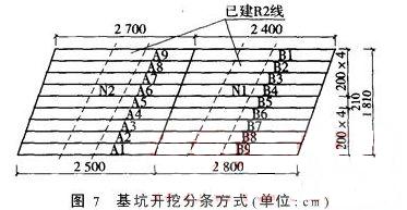 基坑開挖前對施工范圍內(nèi)土體(包括坑內(nèi)土體、坑底土體及隧道周邊土體)進(jìn)行加固,使土體具備自立性,以利土體開挖。待坑內(nèi)土體、坑底土體及隧道周邊土體、卸載抗拔樁達(dá)到設(shè)計強(qiáng)度(底板以上土體強(qiáng)度達(dá)到1.0MPa,底板以下土體強(qiáng)度達(dá)到1.2MPa)后才進(jìn)行開挖。N1、N2兩個基坑均長約26m,寬18.1m,與地鐵二號線近于垂直,出于保護(hù)地鐵線,不能按照常規(guī)方法進(jìn)行土方開挖,必須考慮分層、分小段、分條開挖。