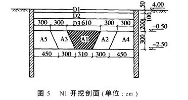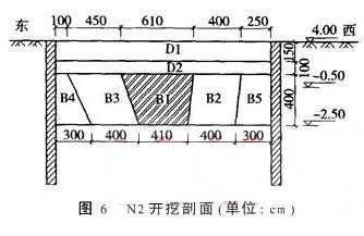 基坑深達(dá)6.5m,不應(yīng)一次開挖到底,一次大面積卸荷會使得地鐵隧道的回彈量過大,超過地鐵保護(hù)的要求限制。對于N1段,因為加固的時間相對較短,坑內(nèi)土體的強(qiáng)度相對較小,故分4層開挖,上面的3層(D1、D2、D3)采用整體挖除(圖5),下面的一層分條開挖。破土削掉0.5m土層D1,監(jiān)測數(shù)據(jù)在控制范圍以內(nèi)再挖D2層,D2層厚1m,地鐵隧道回彈量為0.75mm,而后挖D3,D3層厚2m,地鐵隧道回彈量為1.98mm,很明顯,大面積卸荷時,卸荷量對地鐵隧道的影響非常的大。N2段一方面由于土體加固的時間相對較長,坑內(nèi)土體的強(qiáng)度也就相對較大,另一方面受實際的施工條件和工期的限制,決定分三層開挖(圖6),一二兩層為一次性挖除,第三層分條開挖,相應(yīng)調(diào)整了每層開挖土體的厚度,監(jiān)測結(jié)果顯示地鐵隧道的回彈量完全在控制的范圍內(nèi)。