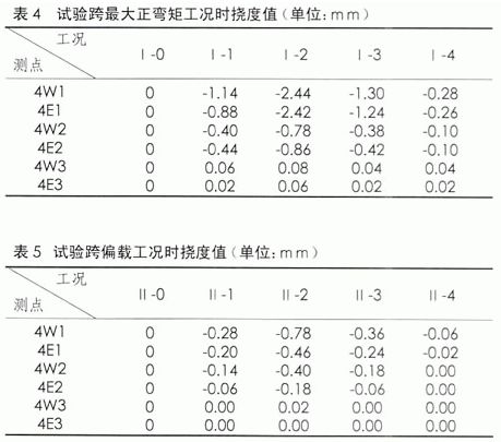試驗跨撓度測試點位置,最大正彎矩工況時,其對應(yīng)的撓度見表4;偏載工況時,載重車壓西側(cè),各控制點的撓度值見表5。