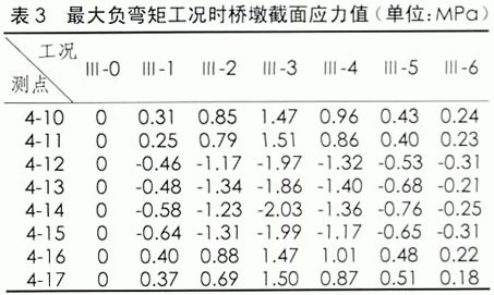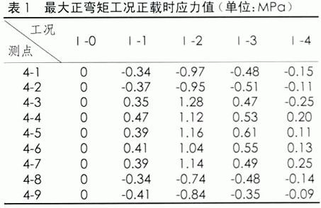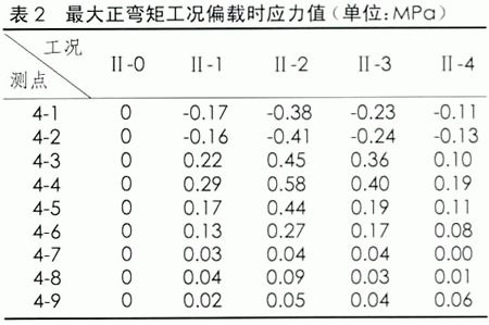 試驗跨跨中和橋墩位置應(yīng)力測試點布置。試驗跨E62-E63跨中截面(1/2截面)在最大正彎矩工況時汽車擺放的位置,其對應(yīng)的應(yīng)力值見表1;偏載工況時,載重車壓西側(cè),各控制截面的應(yīng)力值見表3-2.E62墩最大負(fù)彎矩工況時汽車擺放的位置,其對應(yīng)的應(yīng)力值見表2。