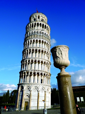 比薩小城,留在人們印象中的總是那久已聞名于世的比薩斜塔,而比薩之所以出名,很大程度上也是因?yàn)檫@座斜塔。自從伽利略在斜塔上完成了自由落體實(shí)驗(yàn)后,比薩斜塔成為比薩小鎮(zhèn)的標(biāo)致性印象。如今,斜塔正是以它獨(dú)有的斜,靜靜地安坐在那里,迎接著來(lái)自世界各地的游人。斜塔的傾斜原因是其位于河川的沖積平原上,土質(zhì)疏松,而塔身通體為大理石,重量達(dá)14200噸,長(zhǎng)年累月不斷傾斜。有趣的是,根據(jù)有關(guān)資料顯示,比薩大學(xué)的音樂(lè)教授托拉比那曾帶領(lǐng)一個(gè)研究小組,在斜塔內(nèi)進(jìn)行音樂(lè)效果測(cè)試,實(shí)驗(yàn)結(jié)果證明其音響共鳴及反射效果俱佳,墻壁表面的反射角度似乎都是為了音樂(lè)效果而精心設(shè)計(jì)的,應(yīng)是依照教堂風(fēng)琴的發(fā)音管原理建成的巨型樂(lè)器。